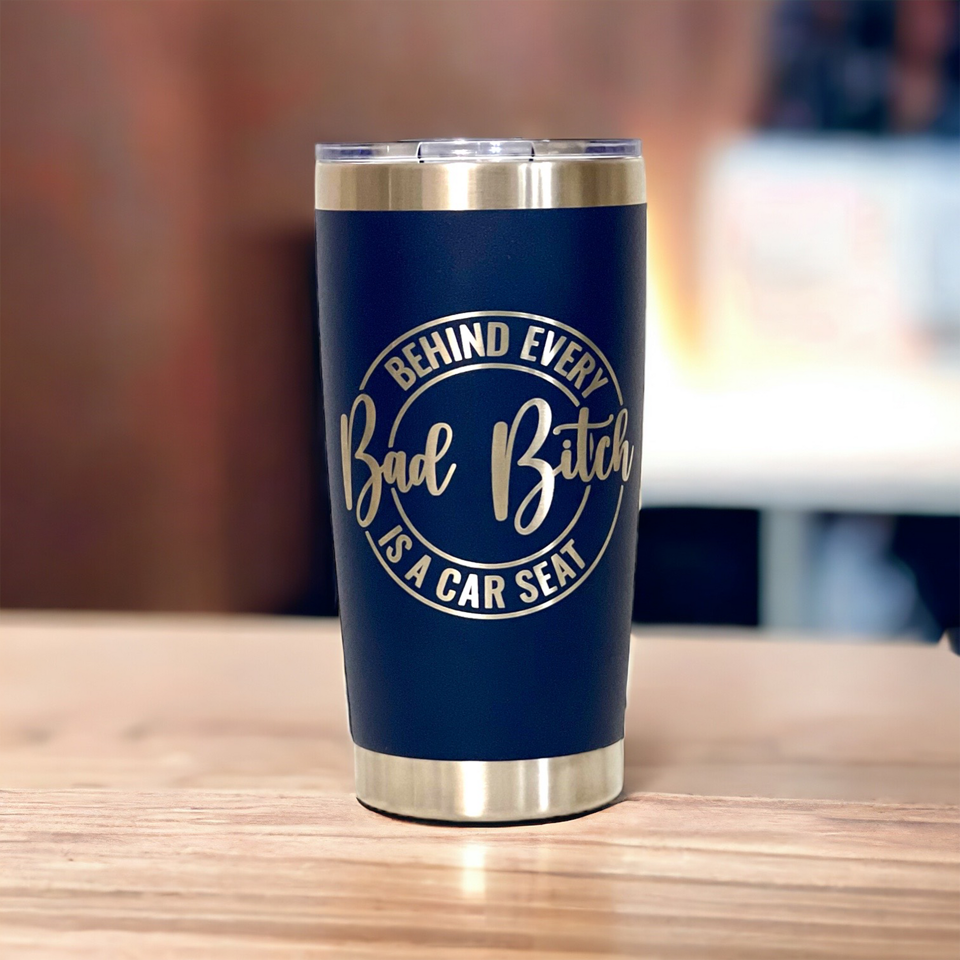 Keep your drink on the go with this engraved tumbler. Featuring a fun "Behind Every Bad Bitch is a carseat" etching, this travel mug adds a touch of humor to your daily routine. Perfect and fun, this fun tumbler keeps your drinks at the perfect temperature while showing off your unique sense of humor and style.